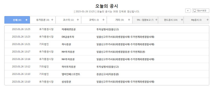 오늘의 공시는 30초 간격으로 갱신이 되어서 국내에서 거래되는 종목들을 세밀하게 볼 수 있습니다. 관심이 없는 그룹이나 기업도 이곳에서 나온다면 한번 열람을 해보시고 좋은 정보가 있을때 기억을 해두시면 좋을 것 같습니다.