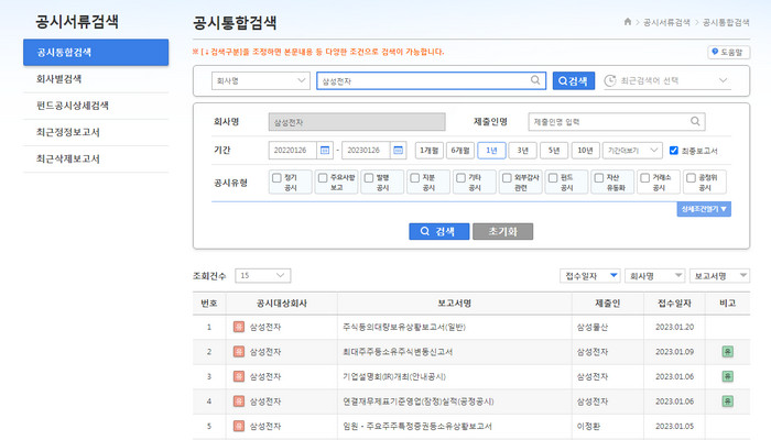 공시검색은 회사이름이나 상장된 주식 종목 코드명을 입력하시면 검색을 할 수 있습니다. 일반적으로 코드명을 기억하기 쉽지 않으니 회사이름으로 검색을 하시면 쉽게 찾을 수 있습니다. 기간이나 공시유형을 선택하여 특정한 조건을 만족하는 결과를 찾을 수 있습니다.