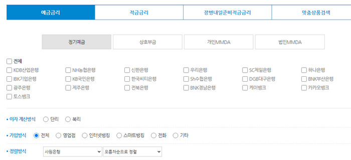 시중에서 영업을 하고 있는 kdb산업은행, 농협은행, 신한은행, 우리은행, sc제일은행을 비롯하여 케이뱅킁, 카카오뱅크나 토스뱅크 등 인터넷은행까지 19개의 금융기관에 조회를 하실 수 있습니다. 가입방식과 정렬방식을 선택하여 가장 높은곳을 찾아보겠습니다.