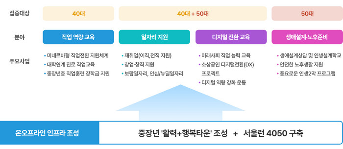직업역량 강화교육, 일자리 지원, 디지털 전환교육, 생애설계, 노후 준비 등 5개의 분야에서 총 48개 사업을 준비하여 중장년에게 꼭 필요한 것을 지원하고 있습니다. 각각의 분야에 주요사업이 들어 있으니 맞춤형 지원으로 평생교육을 받을 수 있습니다.