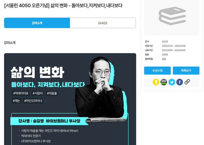 새롭게 개편된 서울런 4050 오픈기념으로 강의가 준비되어 있습니다. 사전에 신청을 하시면 들을 수 있으니 내일을 더 뜨겁게 불태울 수 있는 길라잡이로 선택을 해보시기 바랍니다.