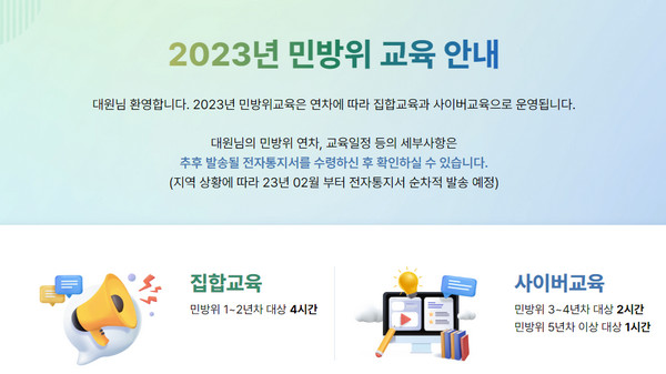 대한민국 남성이 누구나 받는 민방위 사이버교육에 대해서 알아봅니다. 만 20세가 넘는 사람이라면 의무교육을 통해 나라의 부름에 응해야하는데요. 지역마다 차이가 있지만 수강 신청을 하여 일정에 맞게 받아 주셔야 합니다.한동안 전염의 위기로 집합교육이 취소되었지만 다시 일정이 시작되고 있습니다.