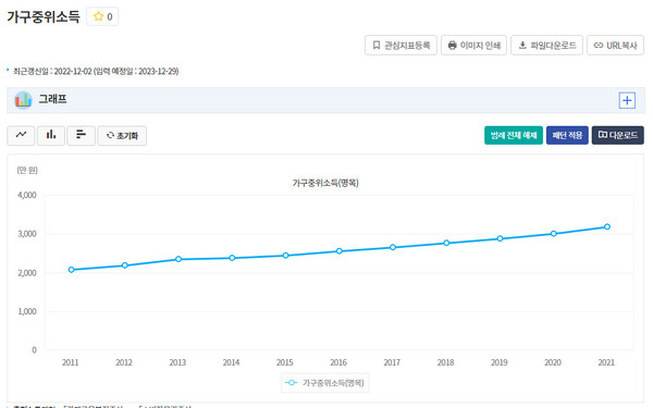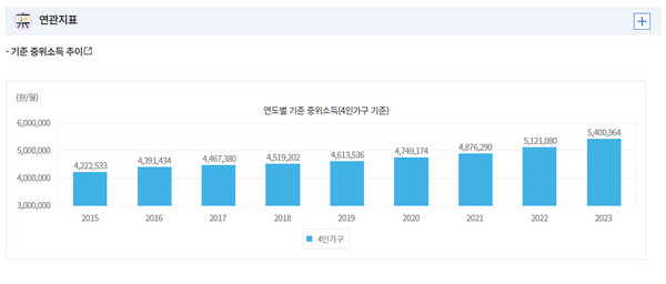 2011년부터 보더라도 해마다 오르고 있는 그래프 선을 볼 수 있습니다. 소득이 많이 올라가는 해가 발생하면 급격히 올라갈 수 있지만 기준이 되는 중위소득은 중앙값이라서 평균을 내어보면 급격한 변동이 나오기 힘든 구조입니다.