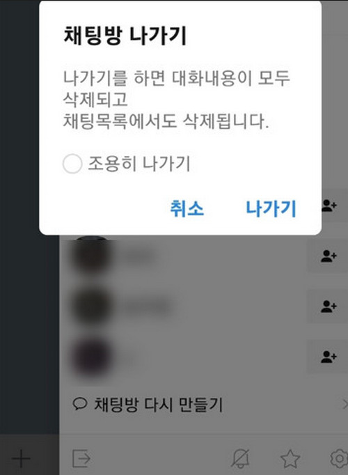 우리가 사용하고 있는 채팅방에서 조용히 나가기를 선택하는 이유는 무엇일까요. 너무 복잡한 것이 싫어서 그냥 있기 싫을경우도 있고 다양한 사유가 있습니다. 공통된 것은 사람이 많은 곳에서 내가 나가도 모르게 하고 싶은 마음이 가장 큽니다.