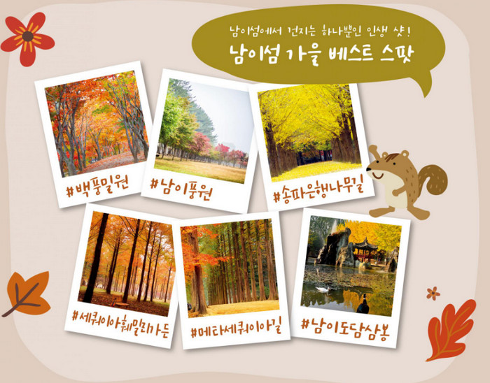 남이섬은 작은 섬으로 가을에는 낭만적인 멋을 보이는 곳입니다. 다른 지역에서 낙엽을 가져와 가을의 분위기를 자아내기도 하고 사람들의 발길이 끊어지지 않을정도로 인기가 많은 곳입니다. 한때는 드라마 방송 촬영으로 외국인들의 인기까지 더해졌습니다.