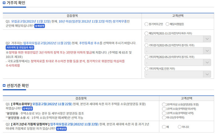 본인의 정보가 표시되고 거주지 확인, 선정기준과 본인 세대의 주택여부, 주택청약통장의 가입기간과 예치금 상태들이 나열됩니다. 청약자격이 만족하지 않는다면 당첨이 되지 않으니 다음기회를 사로잡아야합니다. 청약일정이 이후에도 나오고 있으니 좋은 물건을 다시 찾는다는 생각으로 자격을 만족시킬때까지 기다려보시면서 주택청약 연습하는 방법으로 대비를 해보시기 바랍니다.