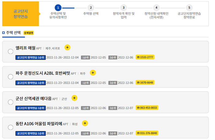 동시에 여러곳이 신청하는 일이 많아 내가 청약을 넣을 곳의 주택이름과 위치는 알아두어야 합니다. 제주, 파주, 군산, 화성 연습을 할때에도 이렇게 다양한 지역이 청약홈에 나오고 있는데 실제로도 일정표를 보면 한두군데 열리는 것이 아닙니다. 연습이지만 실전처럼 거주하고 싶은 곳을 선택하고 넘어가줍니다.