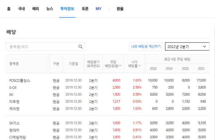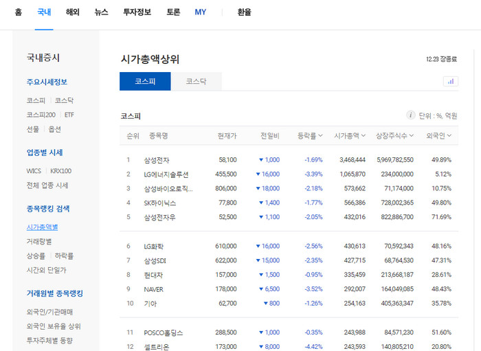 국내주식에서 시가총액순으로 검색을 해보면 개별항목으로 들어가서 확인을 해볼 수 있는데 현재가와 등락률, 상장주식수 등을 보시면서 배당금을 얼마나 받을 수 있는지 찾아 볼 수 있습니다.